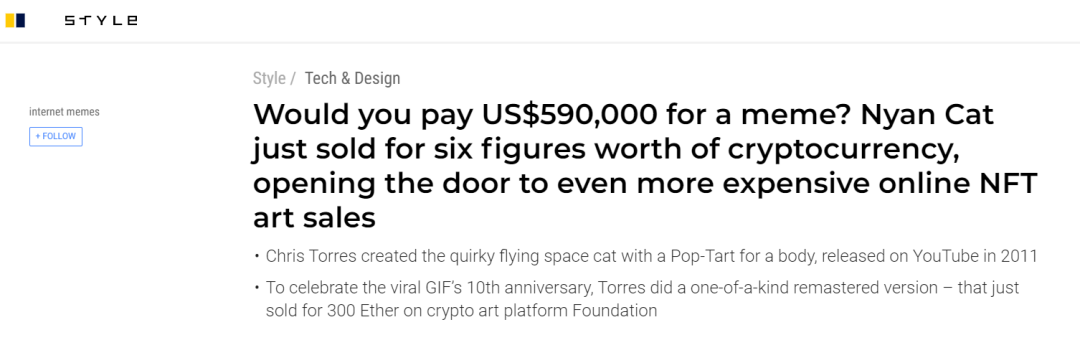 Nyan 猫的原创作者以 300 ETH的价格出售了其 NFT 版本。这证明了,数字稀缺性是有价值的。