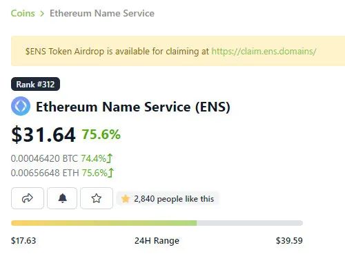 如果您曾经拥有 ENS 名称,您就有资格获得 $ENS 治理代币。领取将于2021年11月8日开始,持续到2022年5月4日,之后任何剩余代币将被发送到DAO金库。