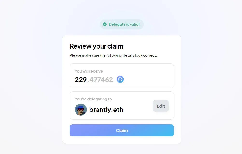 可以选择一个社区成员来代表自己(可以随时更改),通过输入 ENS 名称或以太坊地址委托给未列出的某个人或您自己。