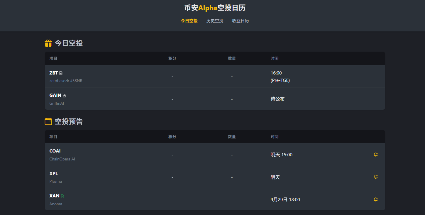 币安 Alpha 空投日历(社区成员制作)