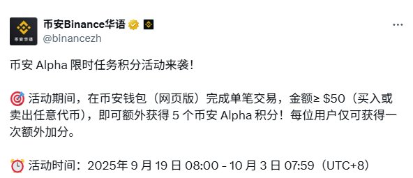 - 任务积分:定期官方会不定时上线限时任务获得额外积分,比如近期上线的任务为:在币安钱包(网页版)完成单笔交易,金额 ≥ 50 美元(买入或卖出任意代币),即可额外获得 5 个币安 Alpha 积分(任务链接:https://web3.binance.com/)。