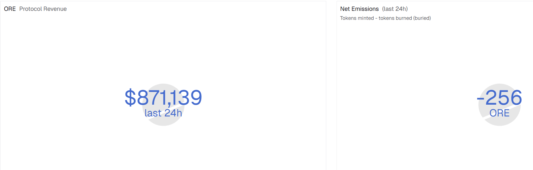 我们可以看到,过去 24 小时,ORE 协议日收入 87 万美元,代币净供应(新铸造代币-销毁代币)减少了 256 枚。按照当前的协议收入,代币日通缩价值约 9.7 万美元。