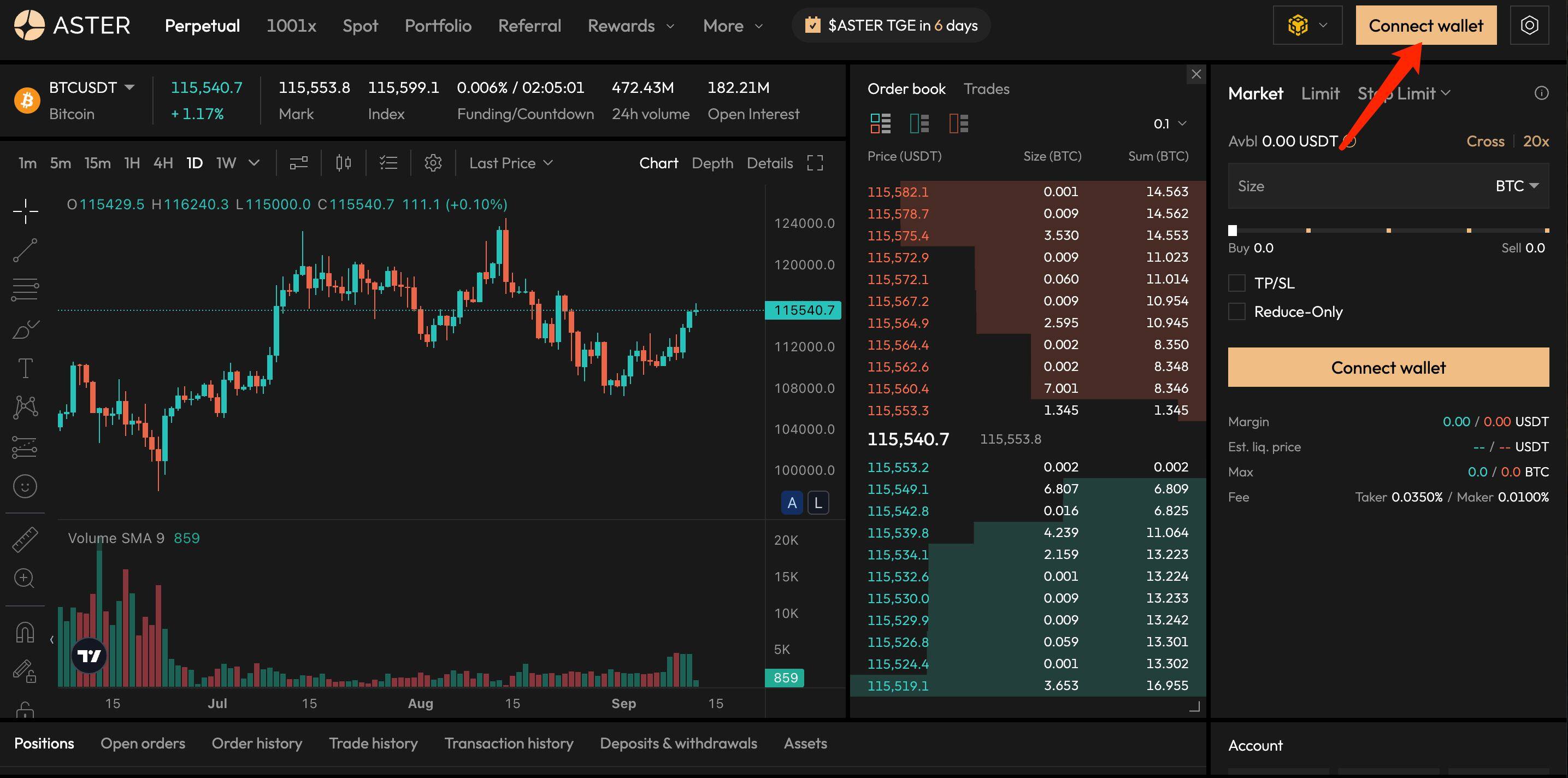 STEP 1. 进入交互网站(链接:https://www.asterdex.com/),并连接钱包。