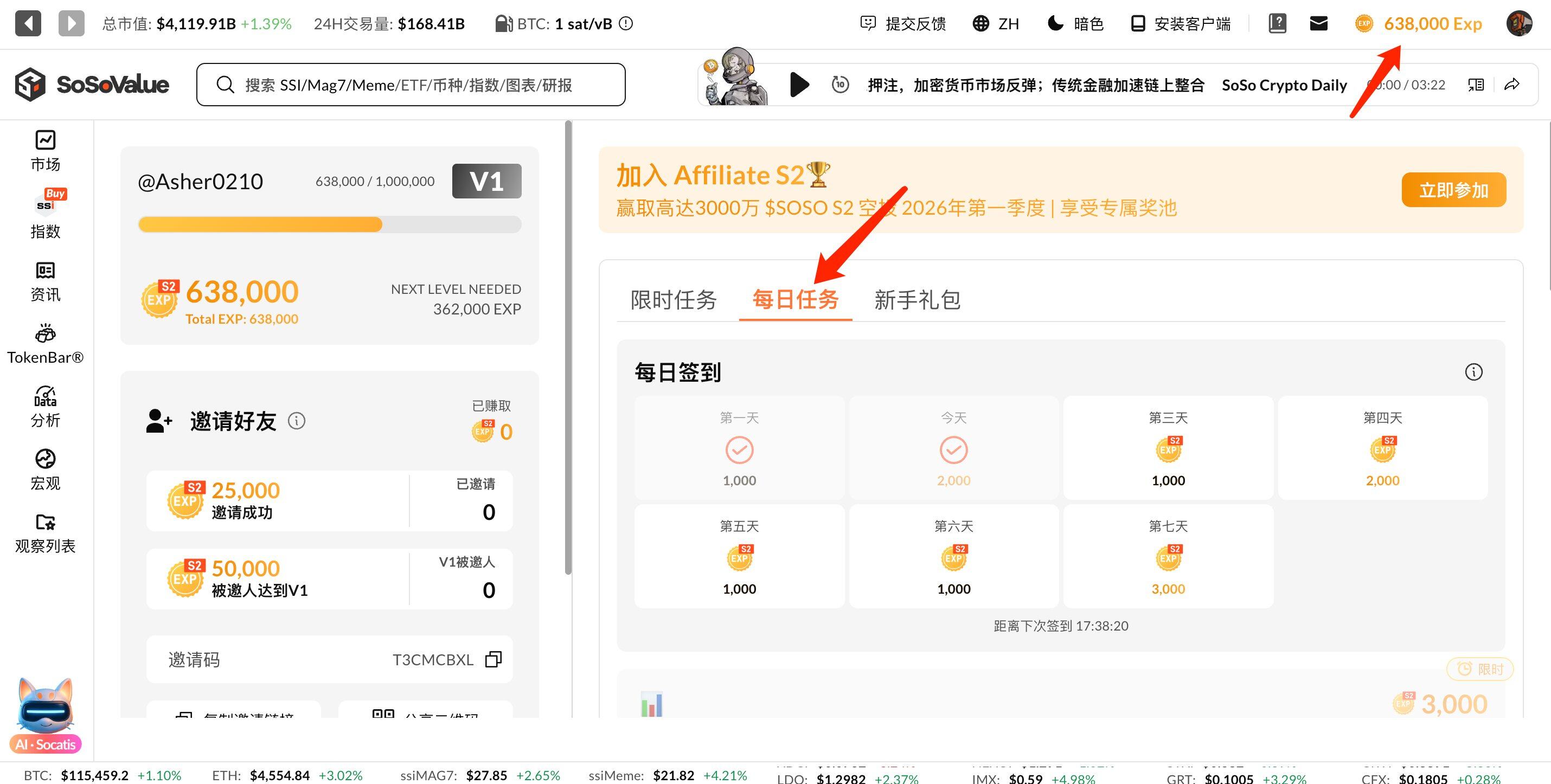 STEP 2. 如下图所示,点击 Exp 积分处,选择“每日任务”,包括每日签到等任务活动 Exp 积分。
