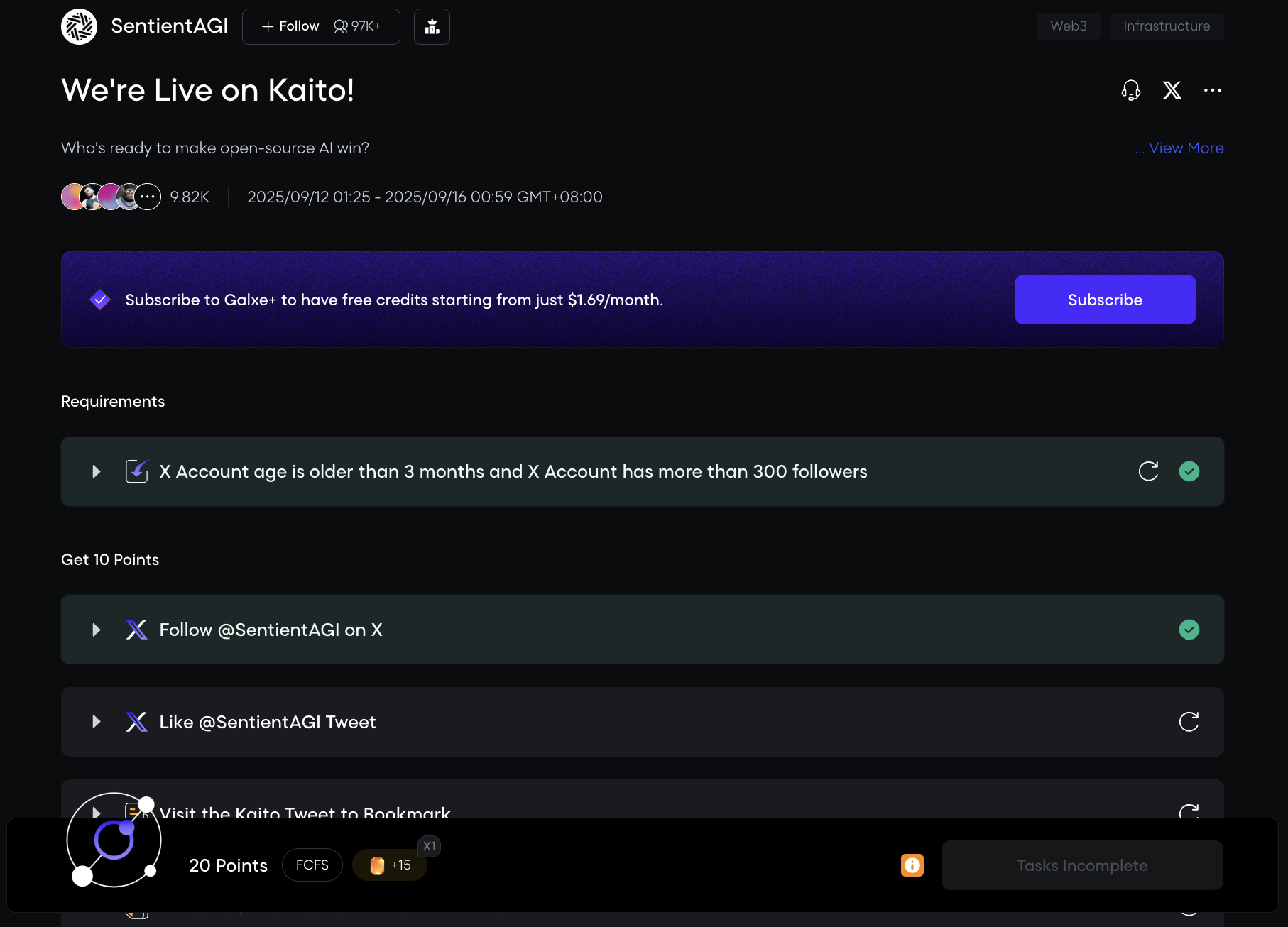 Sentient 今日在 Galxe 上线新任务,9 月 16 日截止(链接:https://app.galxe.com/quest/5pH5qUCoxjtXdLh2XMpRKT/GCVLMt6bN1),为社交类任务,共 20 积分,但需要 X 账户注册时长超 3 个月并且粉丝数超 300 个。
