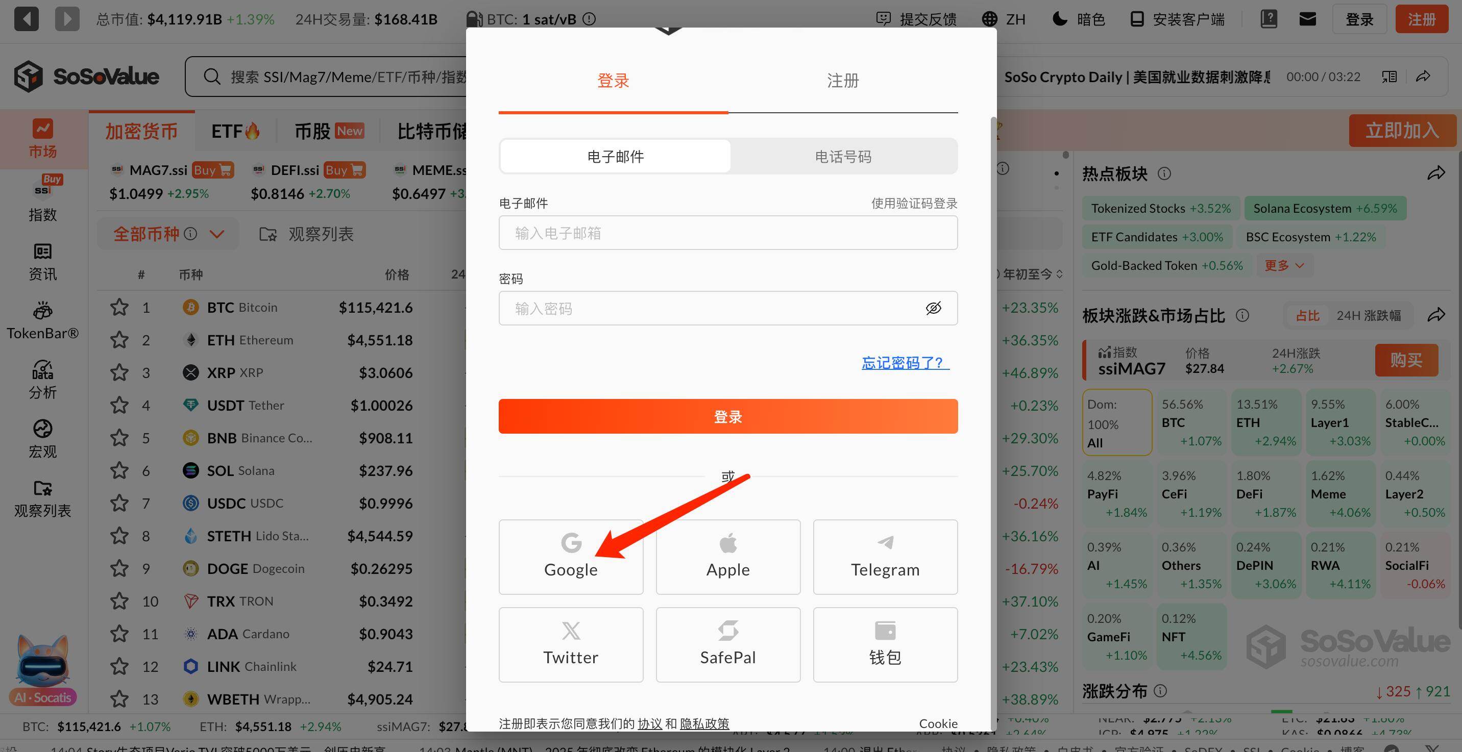 STEP 1. 进入交互网站(https://sosovalue.com/),使用谷歌邮箱进行登录。