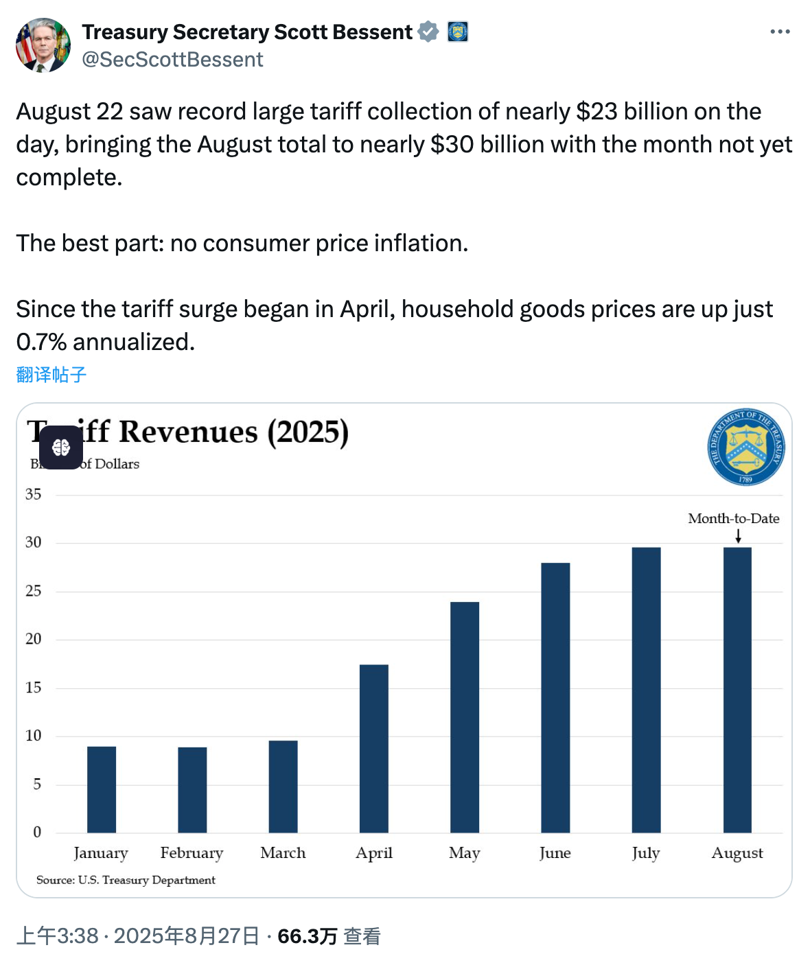 观察特朗普政府执政的半年来,其政策施行大致分为两步,首先在当选之初尽可能履行其竞选诺言,以增强其执政的权威性,例如赋予 DOGE 大量权利、在加密货币政策上的转变等,在巩固了基本盘后,特朗普政府开始了关税的霹雳手段,之所以需要在巩固基本盘后推进关税政策,原因在于抬高关税会造成市场对输入性通胀的担忧,进而增大内部阻力。在获得了极强权威性后,通过几个月的谈判,特朗普的关税政策框架已经初步建立,并且获得成效。根据美国财政部长贝森特的介绍,截止到 8 月 22 日,在过去的半年内关税已经为美国带来近 1000 亿美元的财政盈余,而预计年内可达 3000 亿美元。除此之外,也获得了很多国家的投资许诺,例如来自日本的 5500 亿美元投资、欧盟的 6000 亿美元与 7500 亿能源订单等。