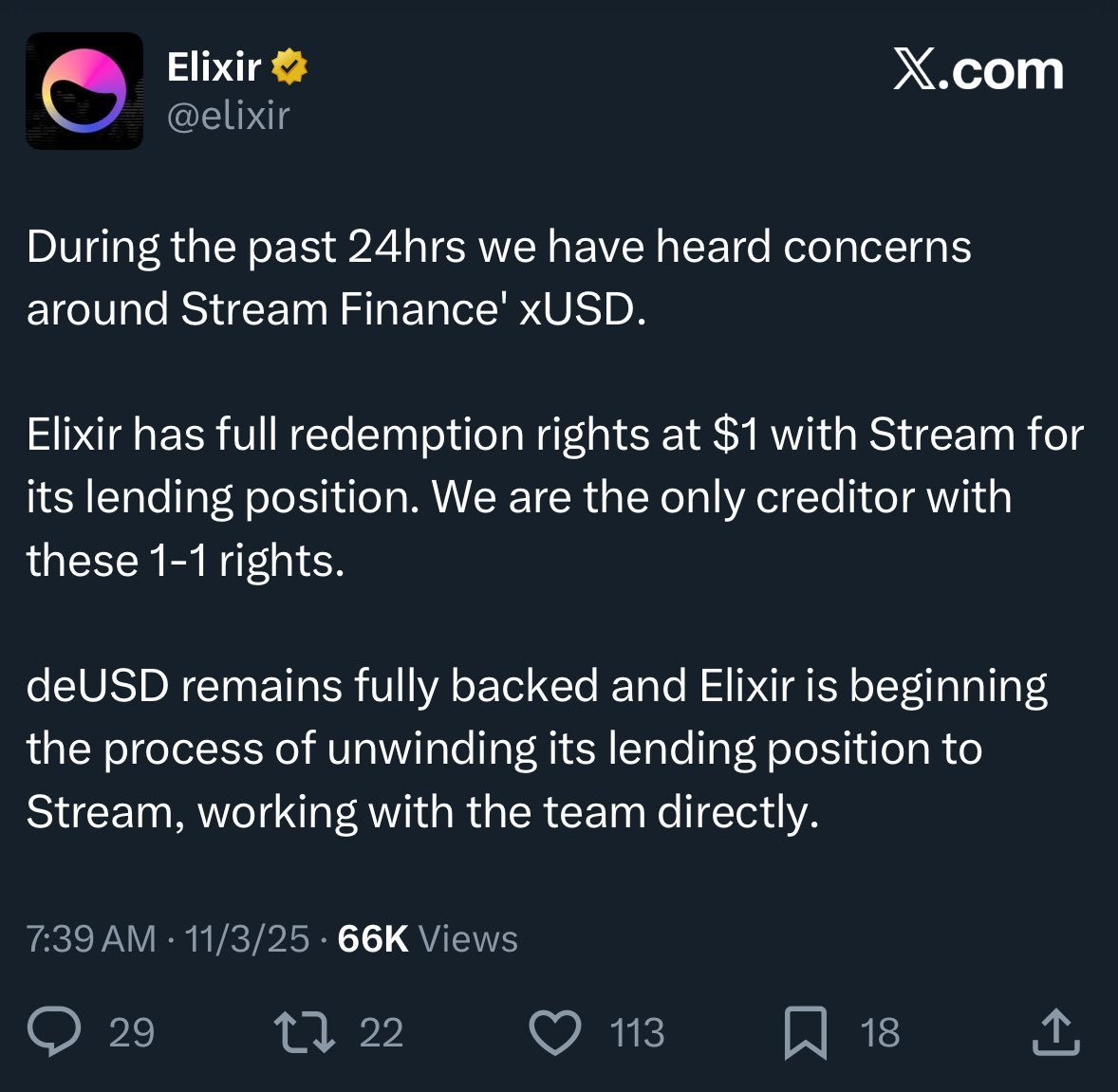 编者按:时隔 24 天,xUSD 脱锚暴雷还是将 Stream Finance 的巨额亏损暴露在了公众视野之中。11 月 4 日,Stream Finance 官方发文承认,外部基金经理披露旗下基金资产损失约 9300 万美元,此外已聘请 Perkins Coie LLP 律师事务所律师进行全面调查。截至撰稿时,xUSD 价格已脱锚至 0.14 美元左右,跌幅高达 87%左右,更令人揪心的是,市场对其回锚已不抱太大期望,而这或许只是“10·11 大暴跌”引发的多米诺骨牌危机下的其中一环。为了探知 xUSD 脱锚及 Stream Finance 巨额亏损的真相,Odaily星球日报特将 Trading Strategy 系列调查编译如下,供读者参考。