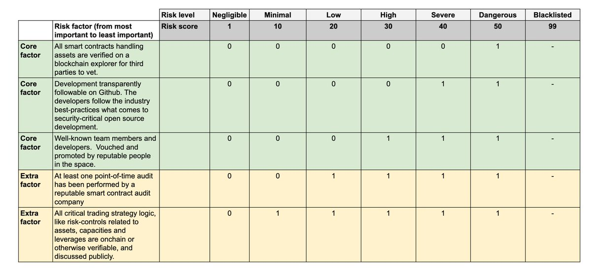 按照几个不同的维度,技术风险是指由于技术执行不力而损失投资于 DeFi 金库的资金的可能性。金库技术风险框架提供了一个简单的分析工具,主要用于将 DeFi 金库分为高风险和低风险类别。 值得强调的是,技术风险评分并不能消除不良交易、风险传导等市场风险,它的价值在于第三方可以评估这些风险(以决定是否要投入资金参与其中)。