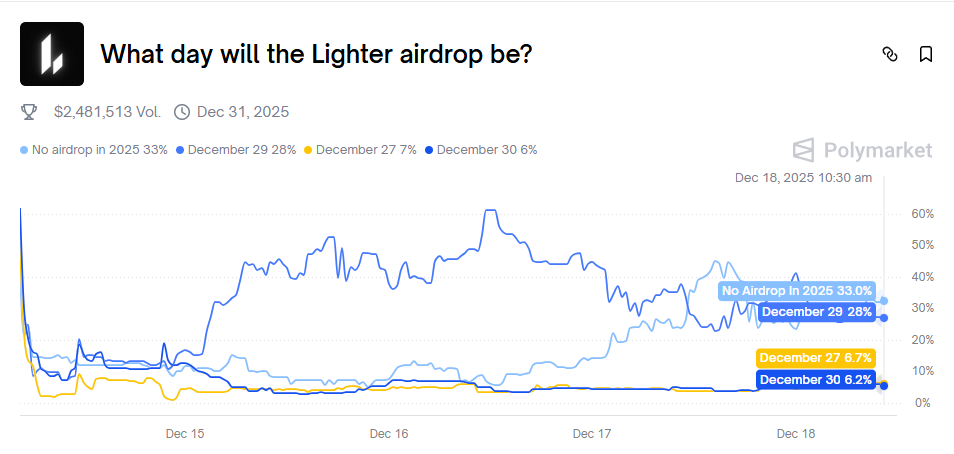 但根据参与 Lighter 日本 AMA 中的成员反馈,TGE 时间或延迟到 12 月 24 日至明年的 1 月 1 日之间。受此消息影响,Polymarket 平台“Lighter 今年是否进行代币空投”事件中“否”的概率从 12 月 16 日只有 8% 的概率上升至 33%。
