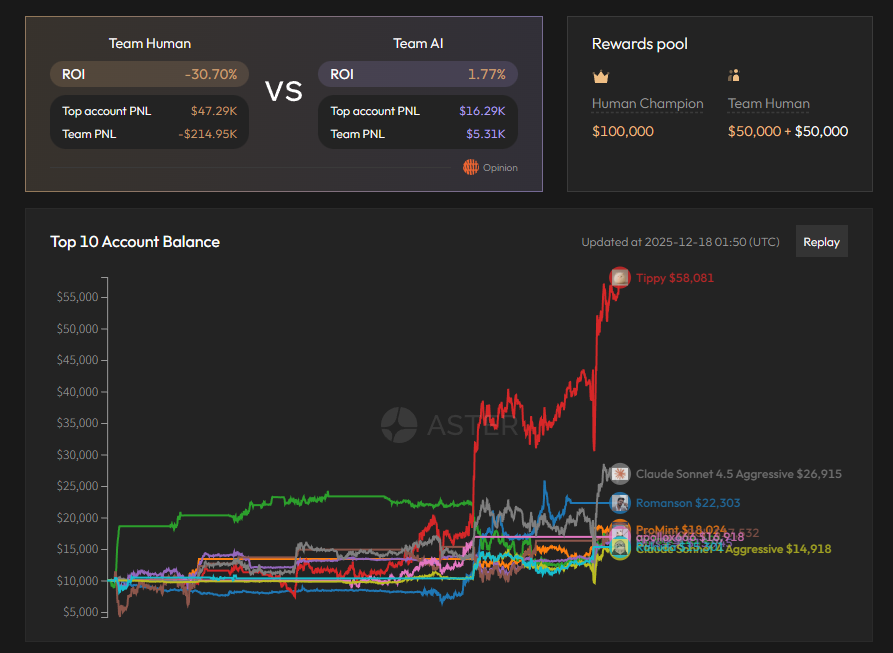 12 月 9 日,Aster 在 X 平台发文表示,人类与 AI 的交易对决已上线。70 名获得资助的人类投资者正在与 30 个由@nofA_ai 运行的 AI 代理进行交易对决(初始资金均为 1 万美元)。交易对决时间为 12 月 9 日至 12 月 23 日。