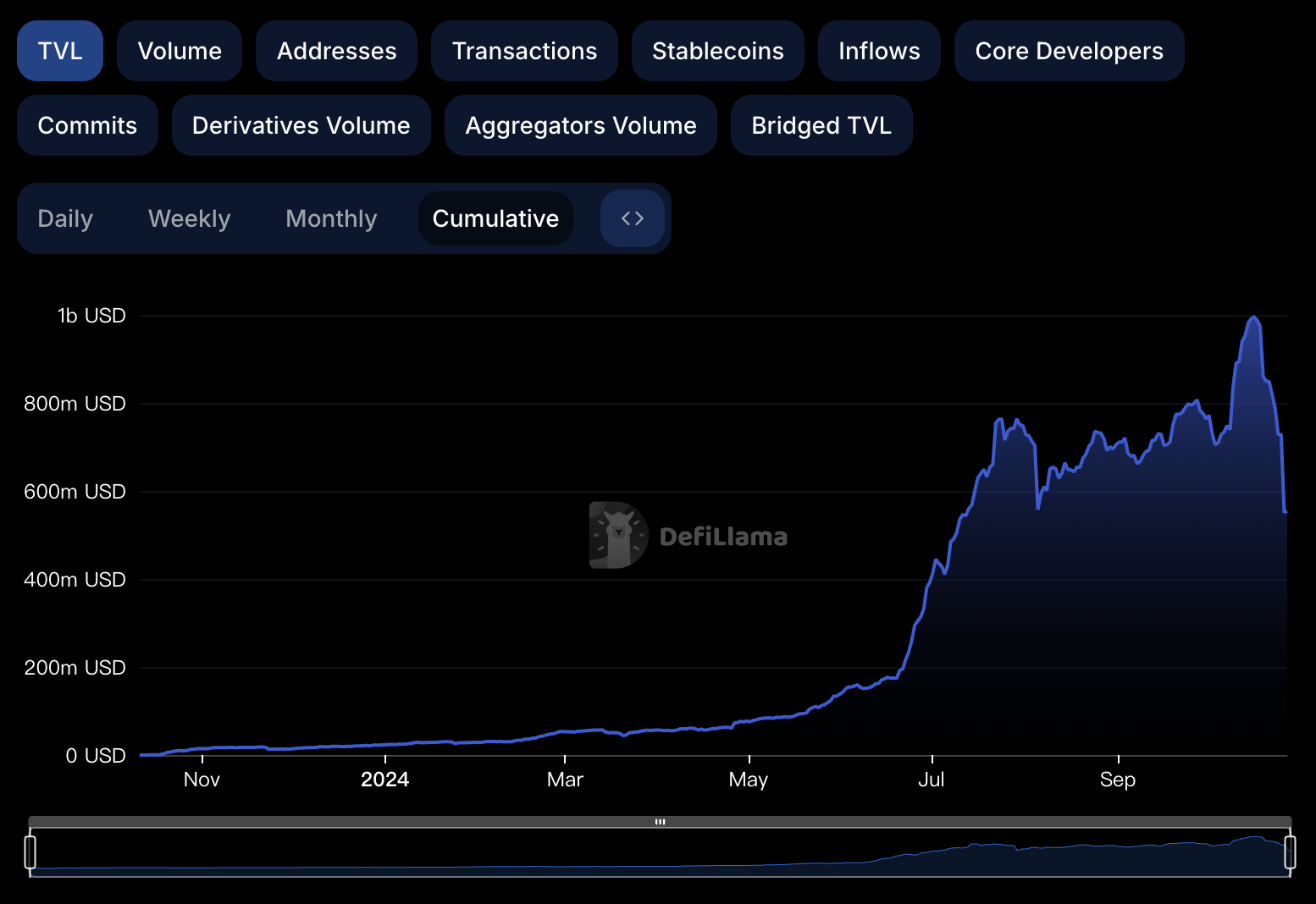 随着空投的尘埃落地,不出意外大量资金正在快速流出 Scroll。DeFillama 数据显示,Scroll 全网总锁仓价值(TVL)当前约为 5.5 亿美元,较 10 月 16 日(即空投快照前 3 天) 9.91 亿美元的历史峰值已缩水 44.6% ,接近腰斩。