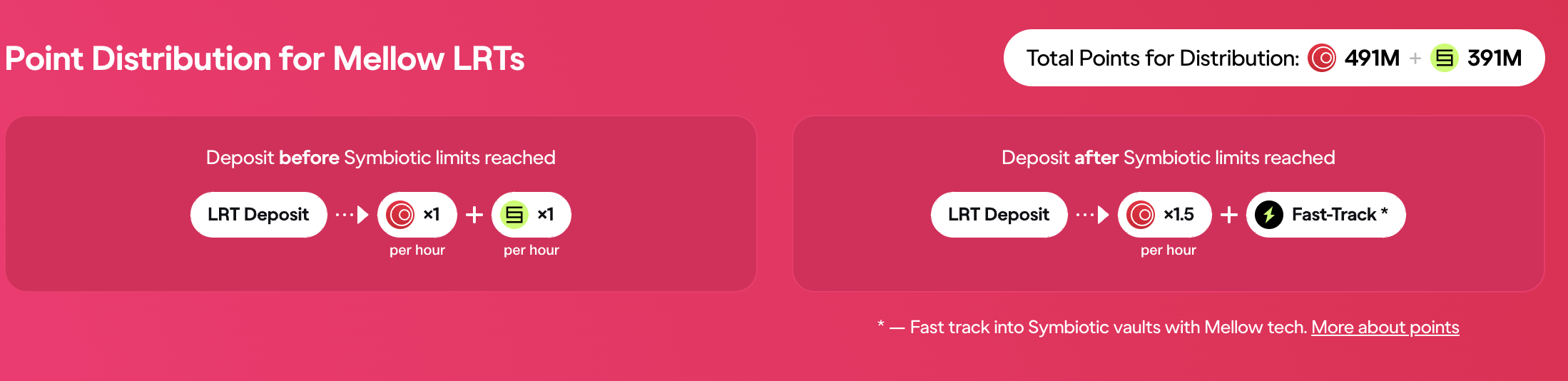 以 Mellow 为例,将资金存入该协议后, 若资金在底层尚未挤进 Symbiotic,则可以 1.5 倍的效率加速赚取 Mellow 积分;若资金已进入,则可同时赚取 Symbiotic 和 Mellow 积分,以及基础的 ETH 质押收益(大概在 3% 左右)。