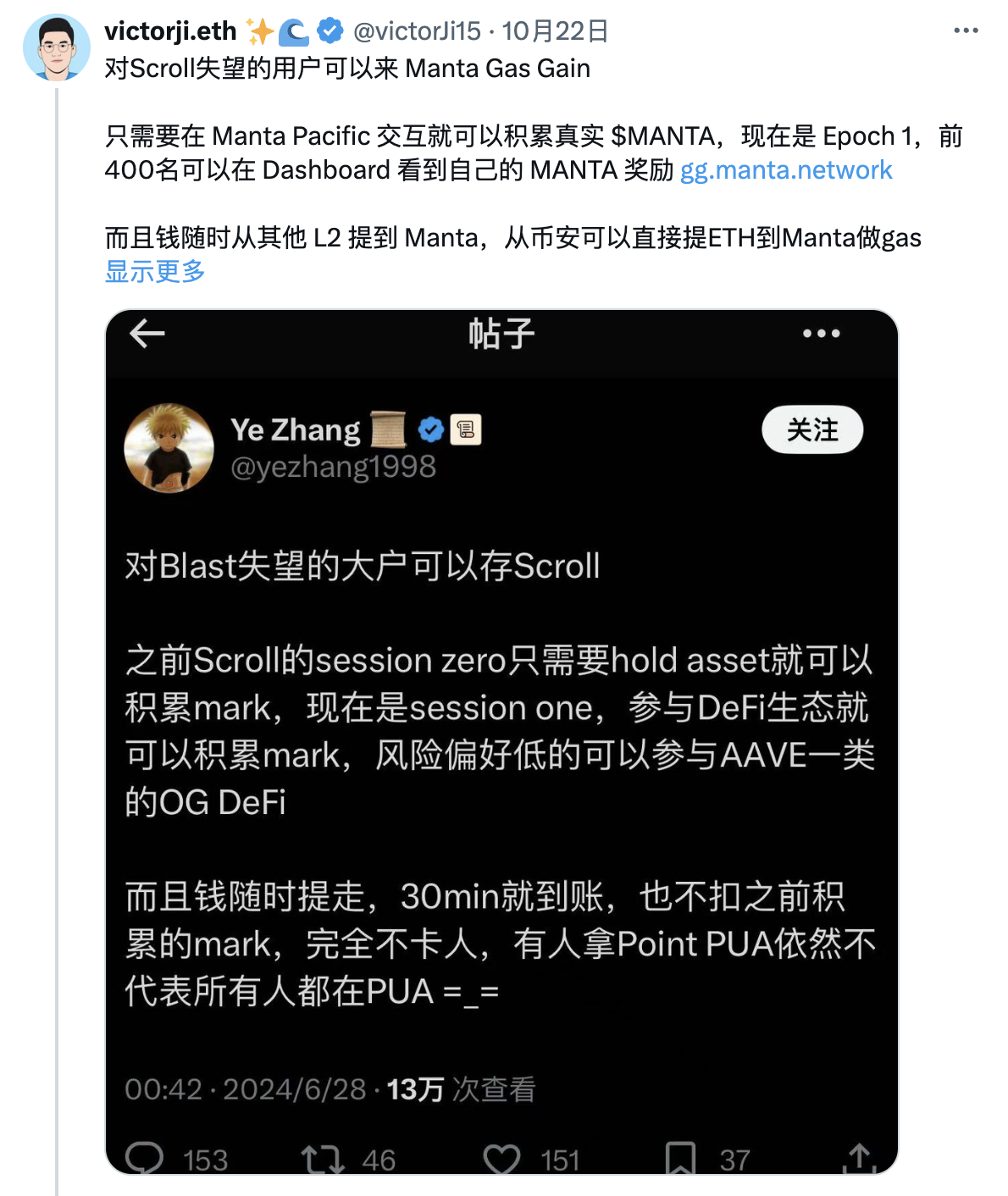 面对真金白银的流出,部分生态已开始明牌喊话,希望能够吸纳这些流动资金。Manta Network 联合创始人 Victor Ji 就曾模仿当年 Scroll 嘲讽 Blast 的话语表示,对 Scroll 失望的用户可以去往该生态体验 Gas Gain 活动。