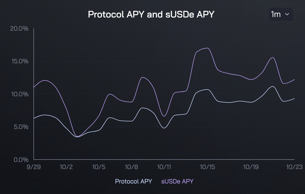 一个是 Ethena 的 sUSDe,即质押后的 USDe。随着资金费率的回升,sUSDe 本身的收益率已回升至 13% 。