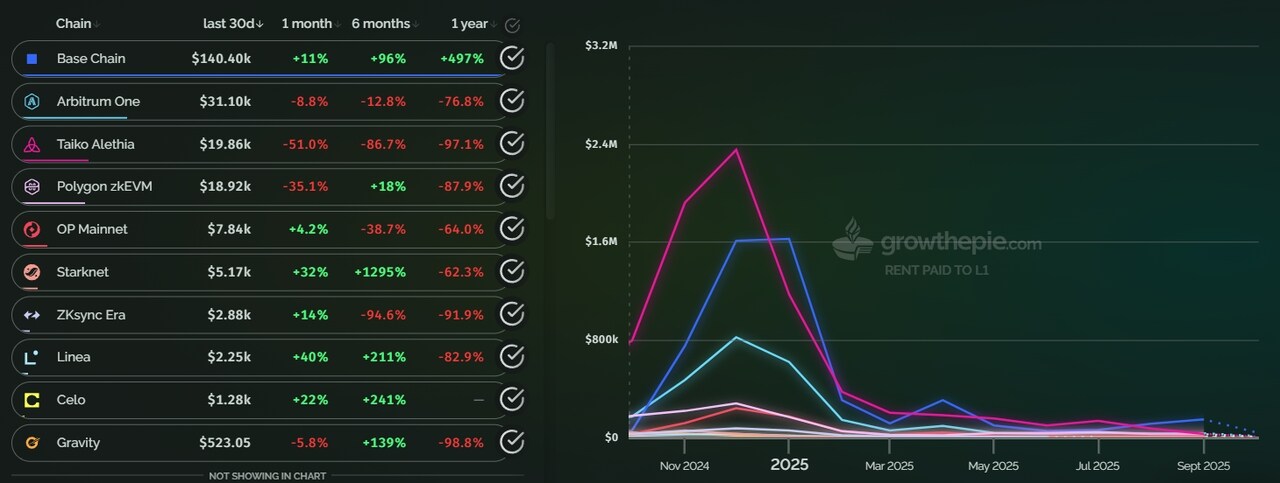 这一战略调整的背景可追溯至 2024 年 3 月完成的 Dencun 升级。随着 EIP-4844(Proto-Danksharding)落地,Layer2 数据可用性成本大幅降低 90%以上。然而,该升级并未带动主网交易量增长,反而加速了交易活动向 Layer2 迁移。与此同时,Layer2 向主网缴纳的"地租"(数据结算费用)仅占其总交易费的约 2%。以 Base 网络为例,其在 2025 年下半年月均 Gas 费收入稳定在 500 万美元【18】,而同期向主网缴纳的地租仅为 14 万美元,占比 2.8%,反映出主网在 Layer2 价值捕获中的贡献度有限。