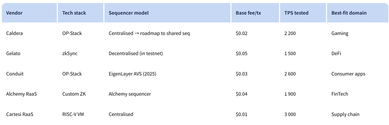 Rollup as a Service(RaaS,打包即服务)并非新兴概念,其在 2024 年曾引发广泛市场讨论。进入 2025 年后,该赛道已逐步进入成熟阶段,新进入者数量显著减少,市场格局趋于稳定。目前主流 RaaS 服务商中,Altlayer 与 Lumoz 主要面向测试网部署场景,而在主网部署方面,多数公链仍倾向于选择技术积累更为成熟的 Conduit 与 Caldera。