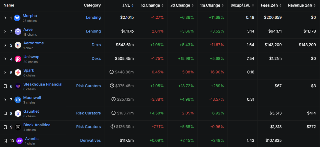 Base 网络 TVL 排名前十的协议(数据截止 2025 年 10 月 29 日),图源:Defillama