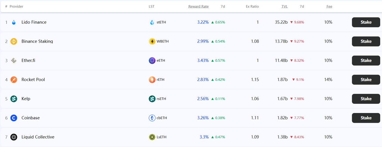 ETH 主要质押平台及质押利率,图源:Staking Rewards