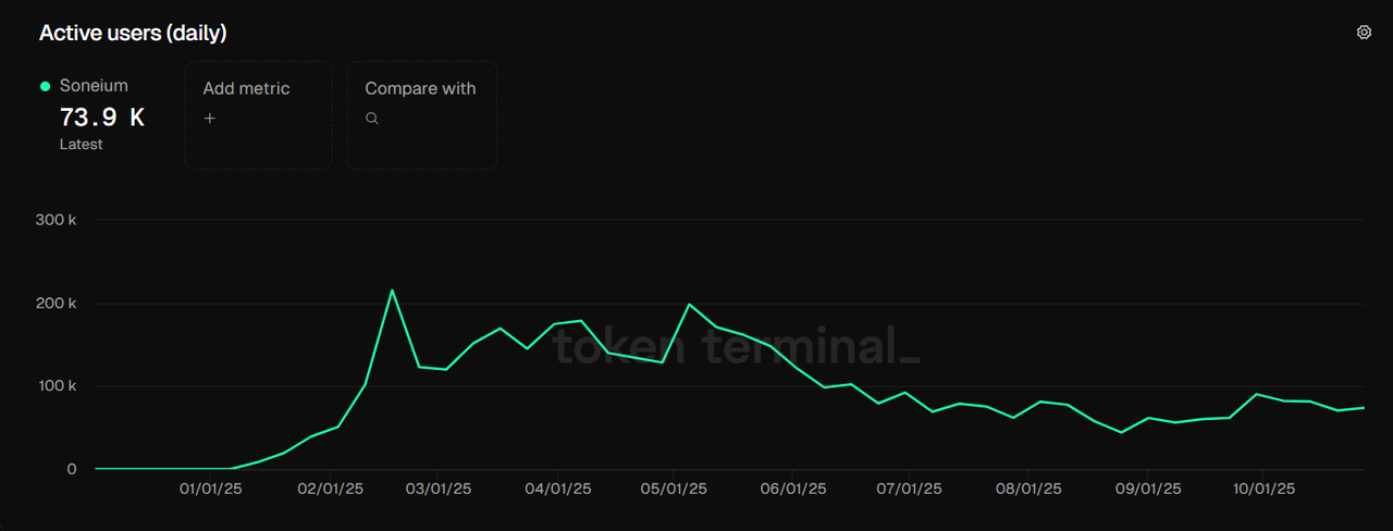 Soneium 网络活跃用户数(数据截止 2025 年 10 月 29 日),图源:tokenterminal