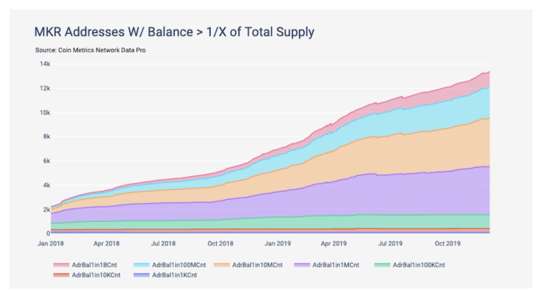 虽然是看起来非常民主的治理,却出现绝大多数投票依然是集中的,并且随着 MKR 的供给量不断上升这样的趋势也会越来越明显,持有少量 MKR 的地址数量一直在稳定增长。但持有至少 MKR 供应总量的十万分之一(至少拥有 6.44 MKR)的地址数量保持着相对稳定的状态。