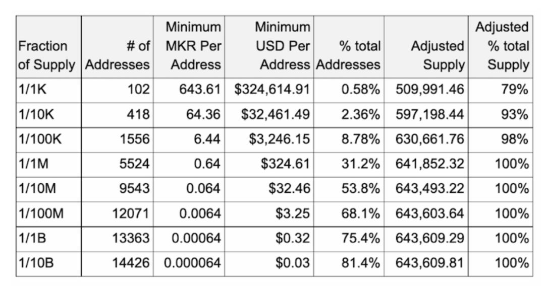 下表根据CM统计显示了至少持有 MKR 总供应量 1/X 的地址的统计信息,其中 X 的范围为一千到十亿。其中,102 个地址至少持有 MKR 总量的千分之一(即 643.61 MKR)。这 102 个地址仅占总地址数的 0.58%,却共持有 509991 MKR,占总供应量 79%。 鉴于最新一轮的投票需要 51910 MKR,因此如果这些排名前 0.58%的地址合作的话,完全有能力控制 MakerDAO 的投票。