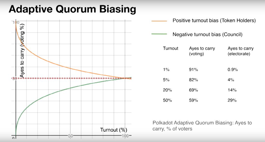 自适应法定人数偏差背后的一般观点是,如果议会提议投票,而且投票率参与率低,那么所讨论的提案就需要更多的反对票而不是赞成票来拒绝公投。然而,在相同的低投票率情况下,如果一个普通的代币持有者提议投票,那么这个提议需要的赞成票要比反对票多得多。