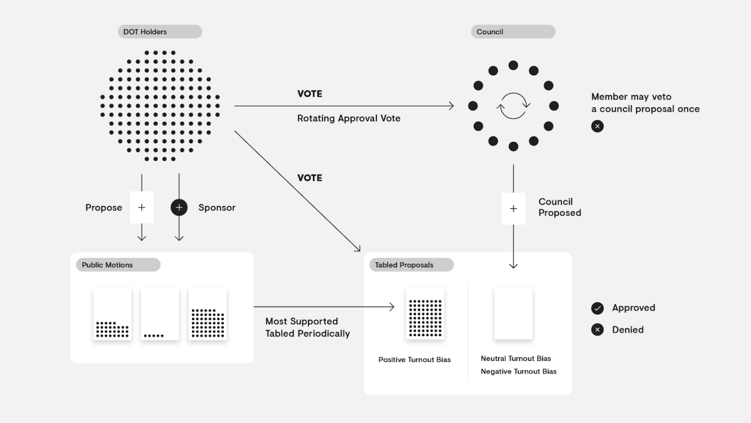 从 Polkadot 治理流程来看主要分为三个阶段:首先是全民提案阶段,所有人都可以进行质押 DOT 进行提案,票数高的提案可以进入公投阶段,所有人可以对提案选择支持或反对,唱票后得到足够多支持的提案就会执行,但是其中也加入了一个议会制度,议会可以发起公投或者取消现有公投,该议会还通过自适应群体偏差直接解决了低投票率的潜在情况。