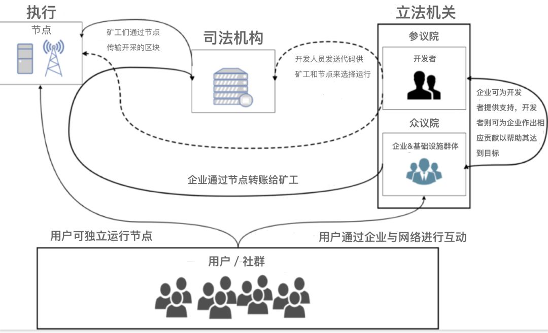 理解最为贴切治理模式就是美国联邦制,举例来说:当参议院需要通过一个新法案,首先就需要议员们提交,当司法部收到请求后,可以选择是否通过,州联邦可选择不执行来行使自己的否决权。在比特币网络中当有人提出了 BIP,就需要开发者们提交合并请求,矿工们收到请求选择通过后才可以开发,节点也有权选择不同步执行来表达自己的否决权,社区持币人同样可以提出异议。最后,比特币经济激励要求维护对系统的信任,这种信任需符合每个人的最佳利益就会自动达到平衡。