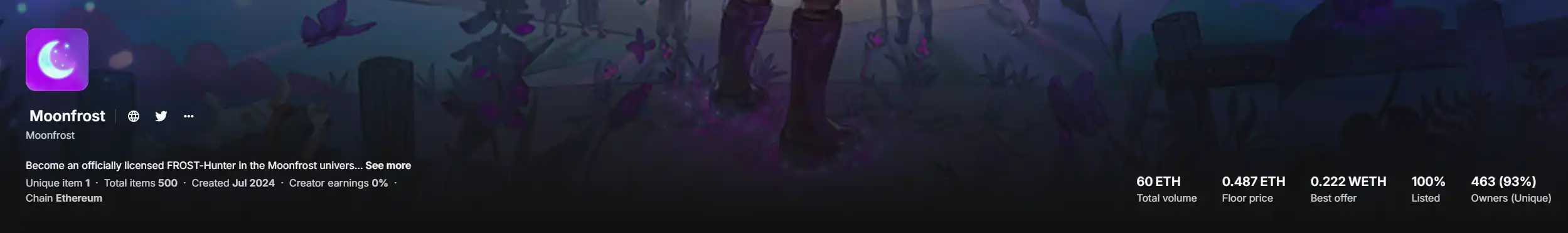 这款「QQ 农场」游戏小编在 5 月底为大家介绍过。如果大家也参与了那轮测试并且幸运获得了其首个 NFT 系列「Frost Hunter Licence」的白单的话,目前就已经有了约 0.5 ETH 的收益。