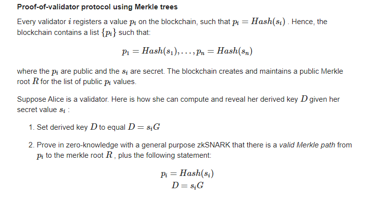 其基本思路是,让每个验证节点在区块链上注册一个公钥,然后利用零知识证明技术,证明自己知悉这个公钥对应的私钥。这就相当于拿出自己的身份证明明自己是验证节点。