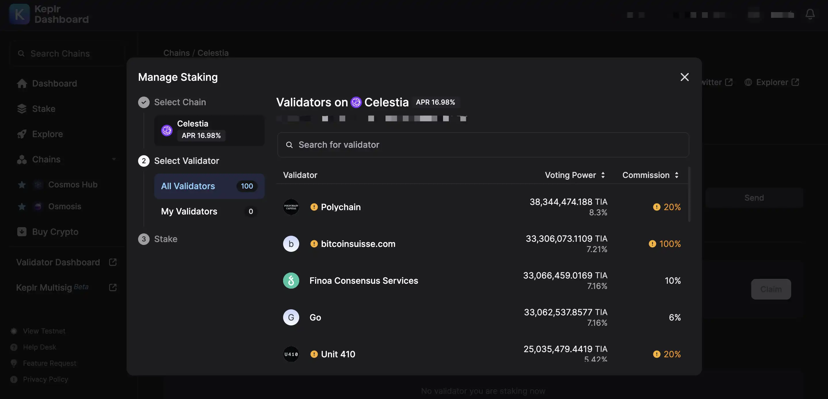 3、选择 Celestia 网络并选择验证器;