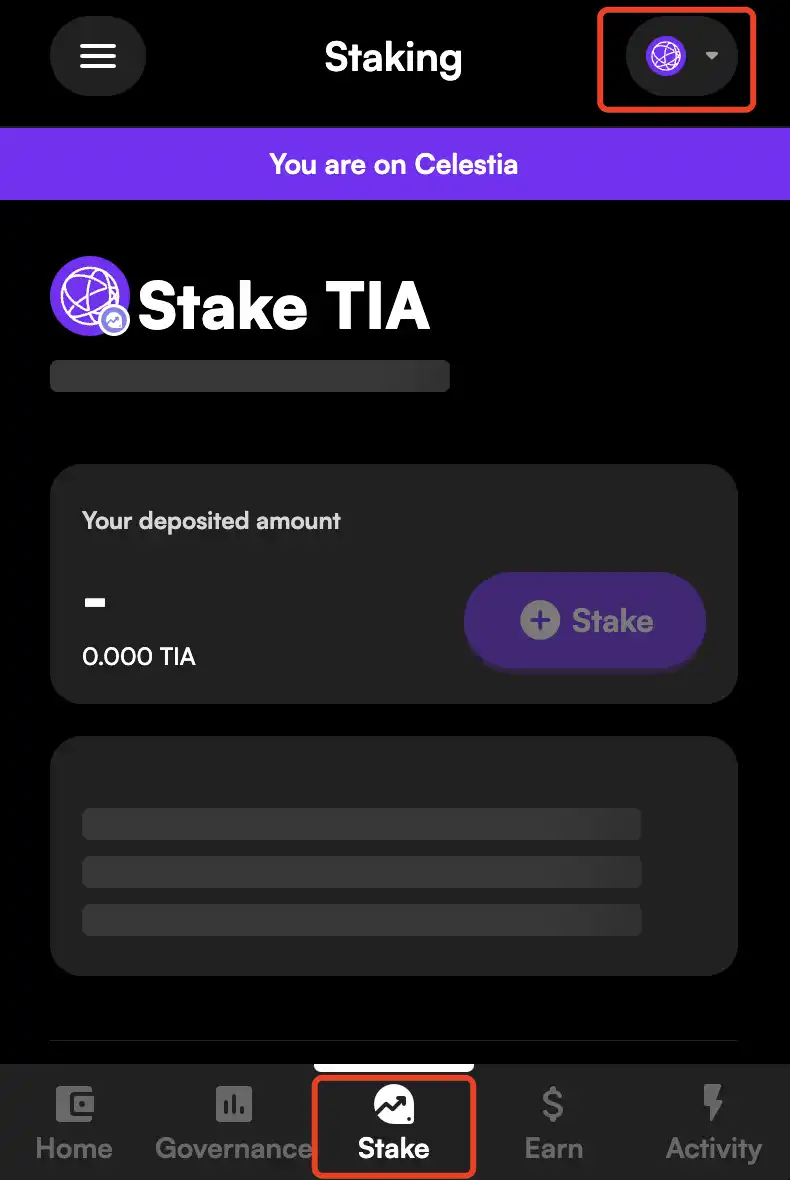 2、如果钱包内有 TIA,就可以看到 Celestia 质押选项,单击「Stake」按钮;