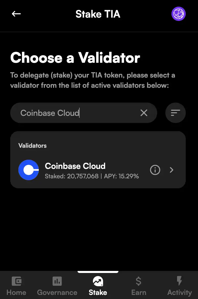 2、点击 TIA Stake,并选择验证器,此处还是以 Coinbase Cloud 为例,搜索 Coinbase Cloud 验证器并单击;