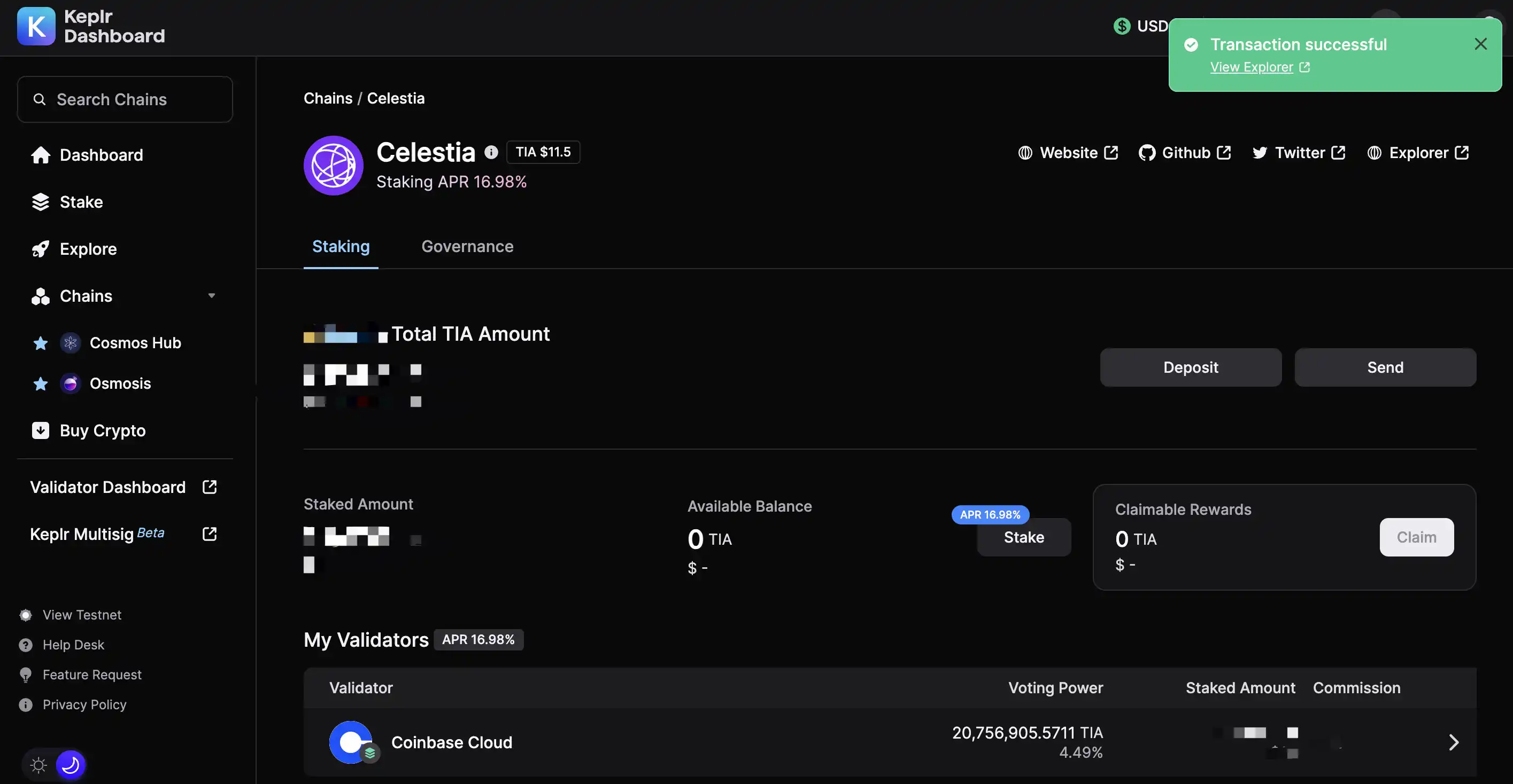 5、如果一切正常,确认交易后可在 Celestia 质押界面查看领取奖励、取消质押、重新委托或质押额外代币。