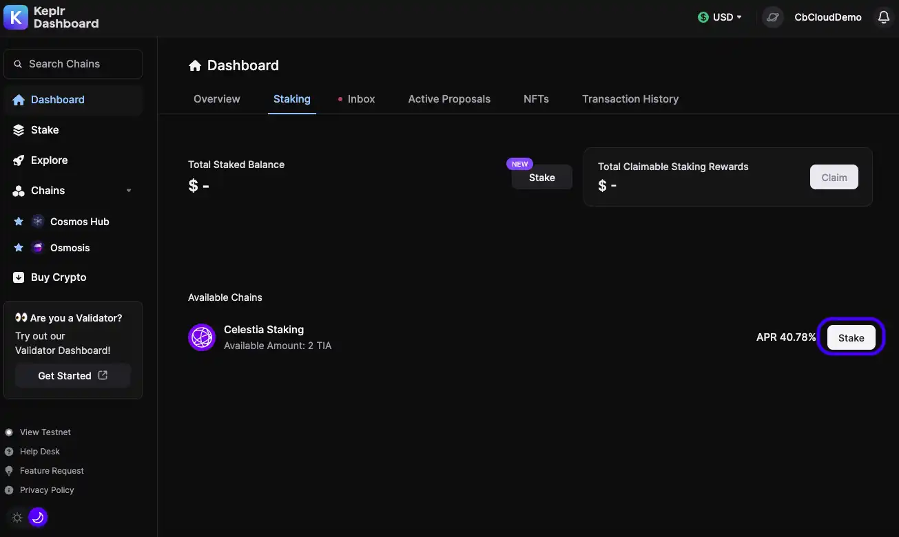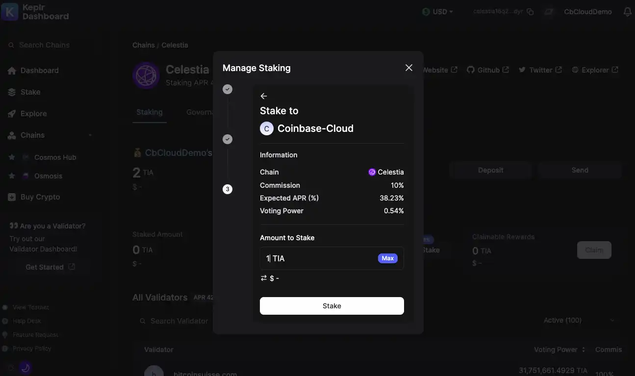 4、此处以选择 Coinbase Cloud 作为 Validator 为例,输入想质押的 TIA 代币数量并选择 Stake ;