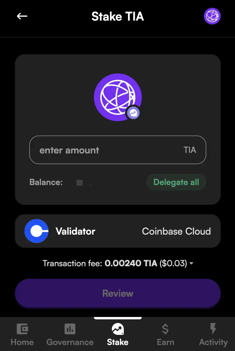 3、输入想要质押的 TIA 数量,然后单击「Review」,确认交易。