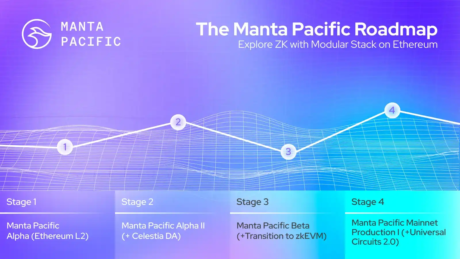 目前,Manta Network 发布的路线图显示,推出主网前将经历四个阶段,分别是 Manta Pacific Alpha 版本,Manta Pacific Alpha II,接入 Celestia DA;Manta Pacific Beta,过渡到 zkEVM;最后对于 Manta Pacific 主网,Manta Pacific 将进一步升级通用电路,以实现更低的 gas 成本。