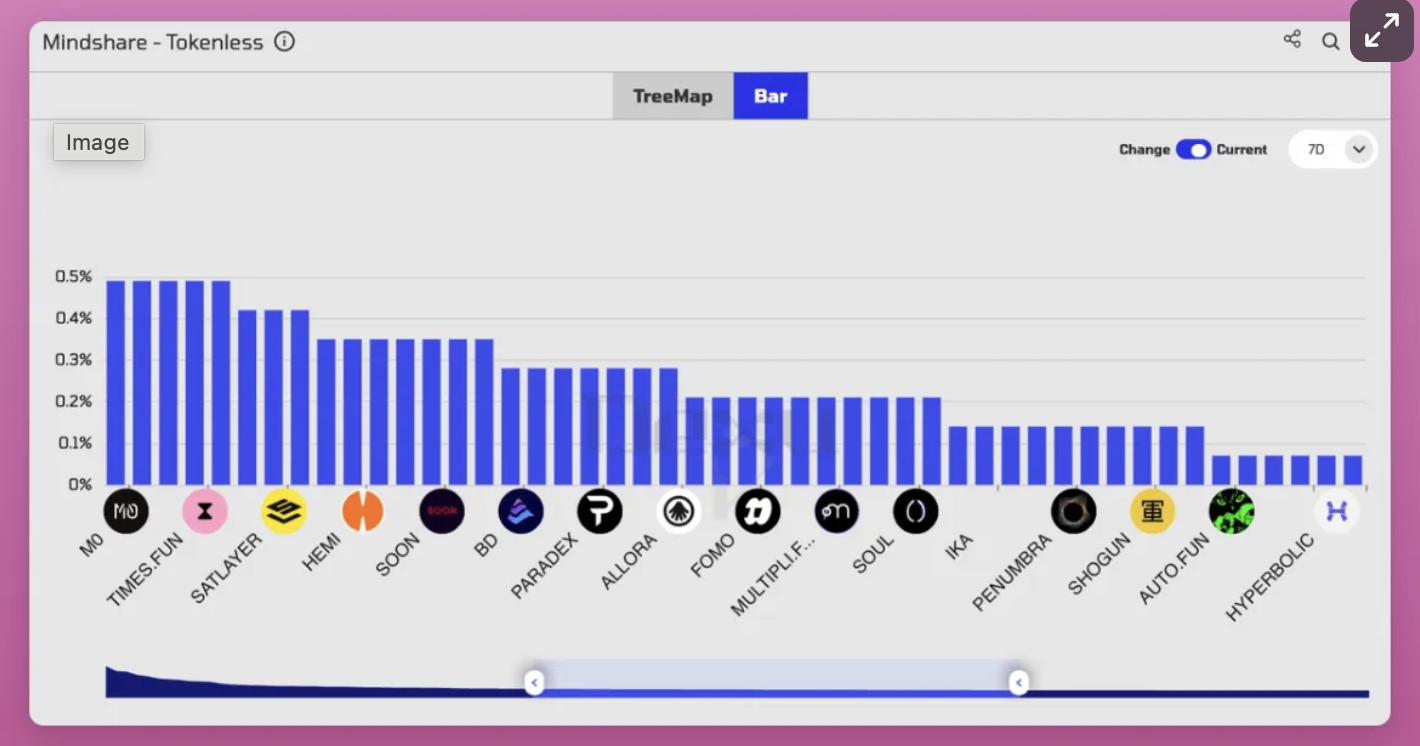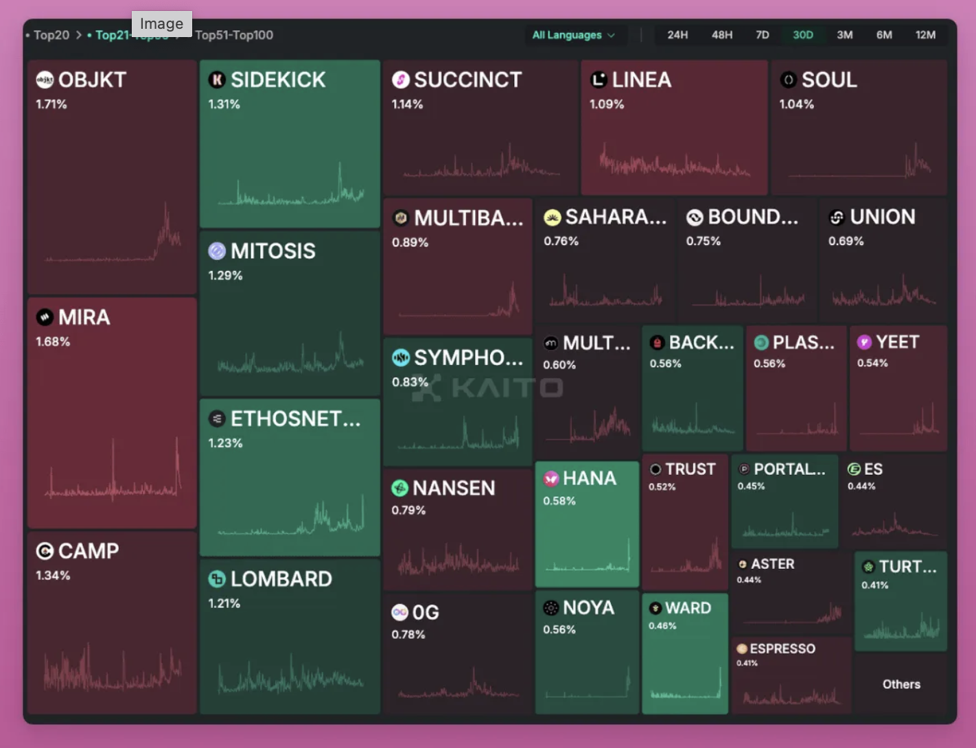 Kaito 的旗舰门户每月费用为 1099 美元(按两年期则降至 750 美元),好在Kaito 提供了一个免费的仪表板,上面按 Mindshare(心智份额)列出了热门项目,且大多没有推出代币。前 20 个项目的截图经常被分享,但你认出前 21-50 个项目中的几个呢?