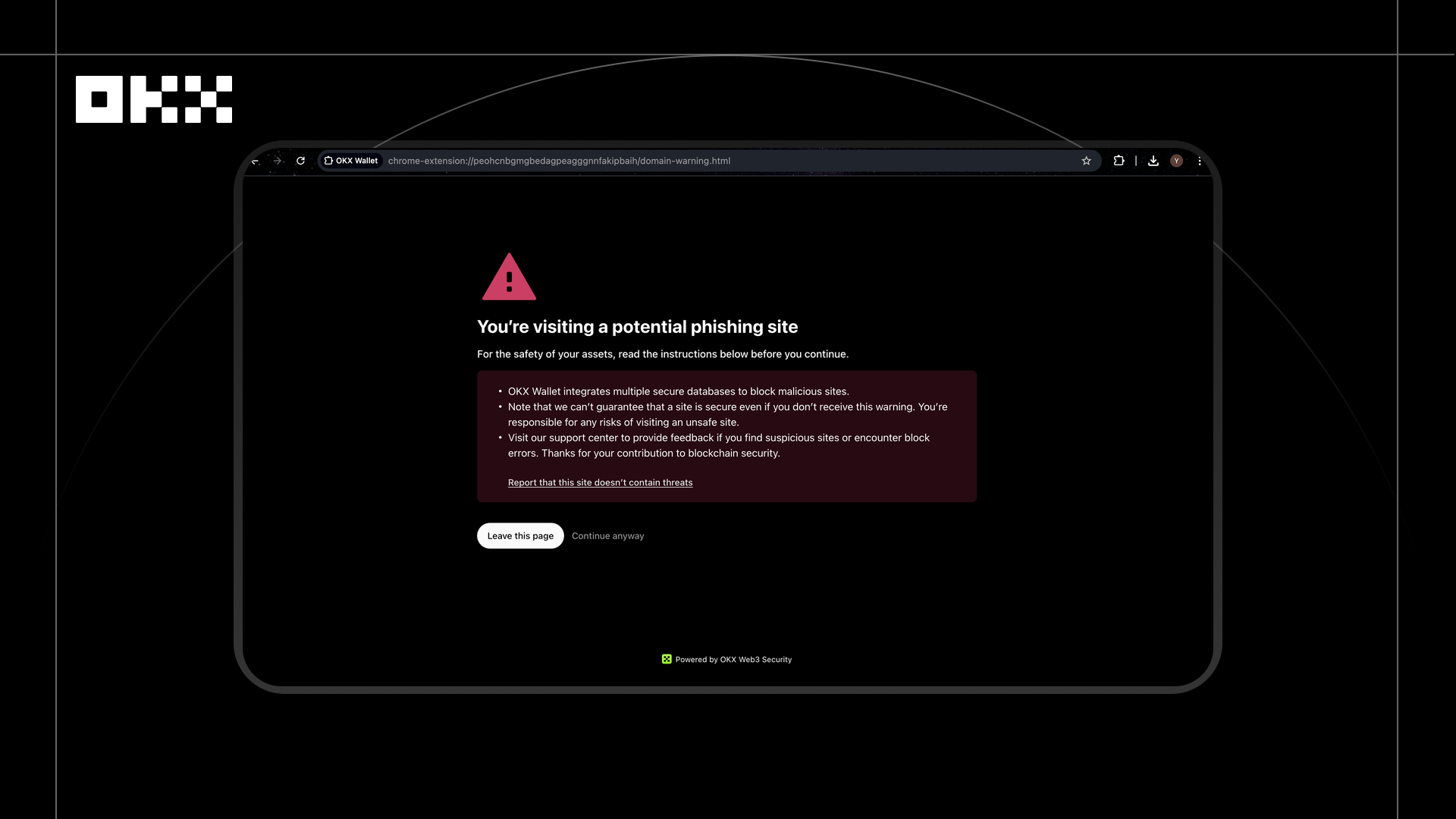 该拦截基于 OKX 的恶意 DApp 与 URL 检测体系。系统在用户访问前对链接和 DApp 页面进行静态与动态安全扫描,识别页面伪装特征、恶意跳转行为、高风险合约调用及异常脚本活动,并依托实时更新的 URL 风险数据库进行分级判断。当检测到钓鱼网站或欺诈内容时,系统会在用户与页面产生任何交互前即刻阻断访问,避免因错误授权导致资产被盗。