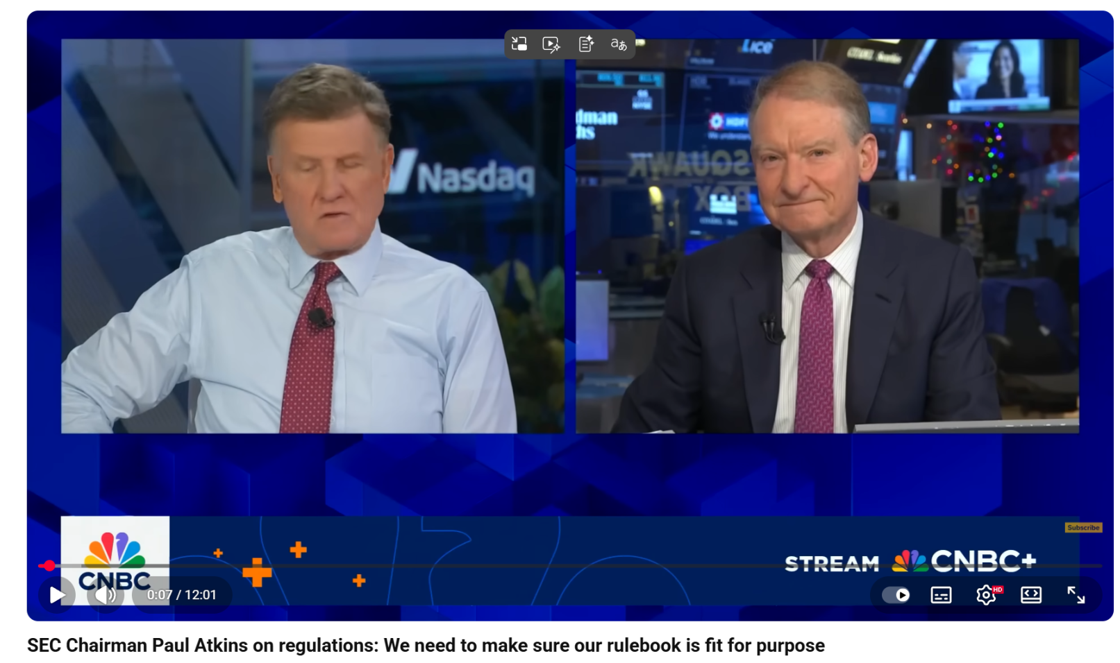 有意思的是,就在 12 月 2 日,美国证券交易委员会(SEC)主席 Paul Atkins 在纽约证券交易所的演讲中,正式宣布结束针对加密行业长达数年的「执法监管」时代,并表示 SEC 将在 2026 年 1 月开启一个全新的合规时代。