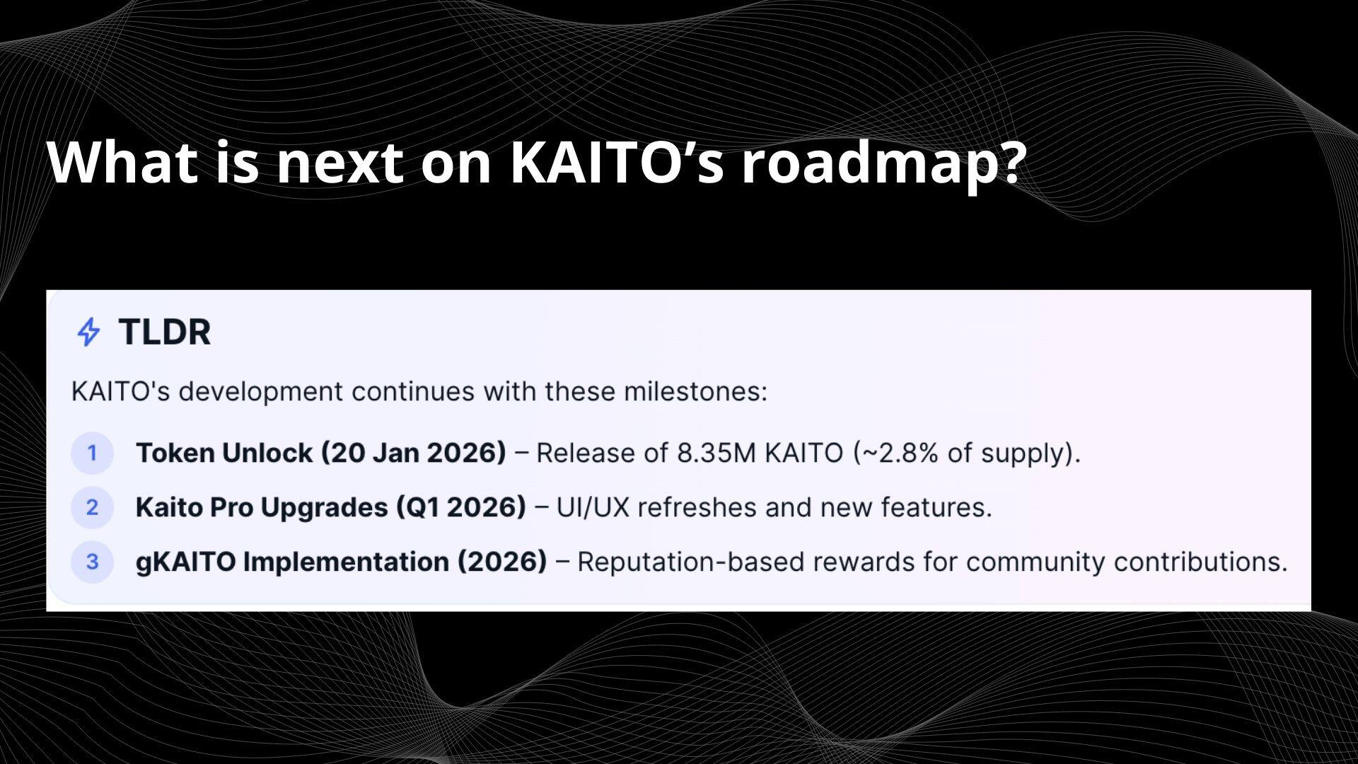 - CoinMarketCap AI|KAITO 2026 Roadmap & Token Unlocks(包含 gKAITO、代币解锁、Pro UI 更新与生态节点):https://coinmarketcap.com/cmc-ai/kaito/latest-updates