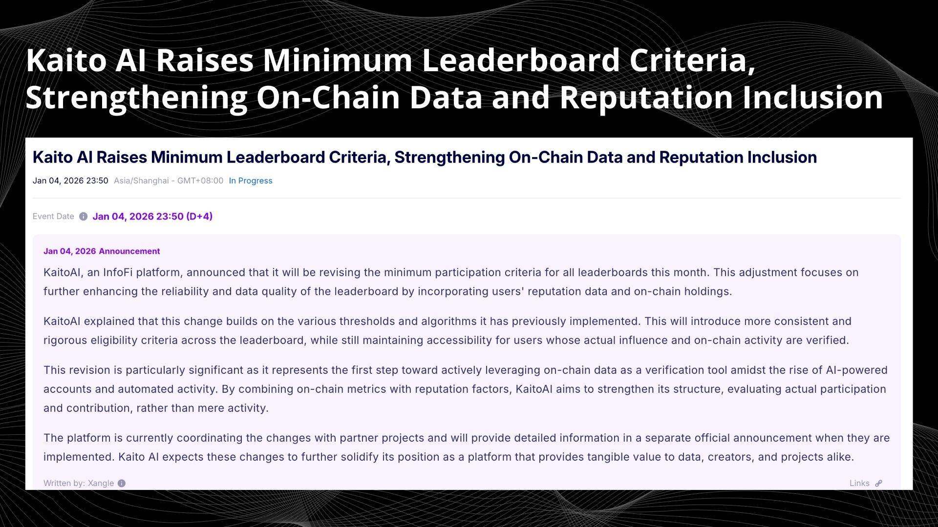 - Xangle|Kaito Leaderboard & Anti-Spam Rule Update (Jan 4, 2026)(文中引用的“排行榜门槛提升、链上权重与反作弊升级”来源):https://xangle.io/en/insight/events/695afdeeb8a643fd1ac69319