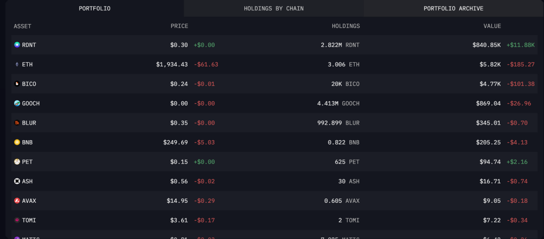通过 Portfolio Archive 功能,可以查看指定时间段内代币持仓数量以及对应价值的变化,从而推演出交易过程,如 AK 在上周内已经开始逐步卖了一些 RDNT 了。