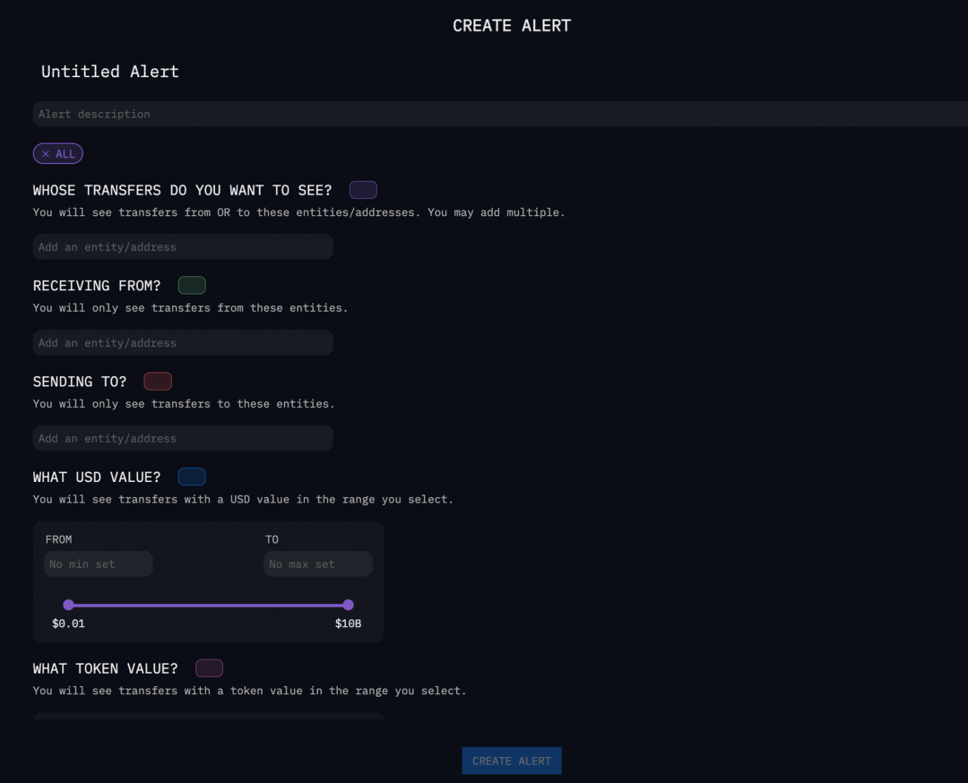 除了以上的分析功能外,Arkham 还设有警报功能。如果你是个跟单交易员,或者非常关注鲸鱼对某一代币的持仓,就可以使用 Alert 功能,设置好阈值金额,观察对象,甚至特定账户,发生异动时就能够直接邮件通知。