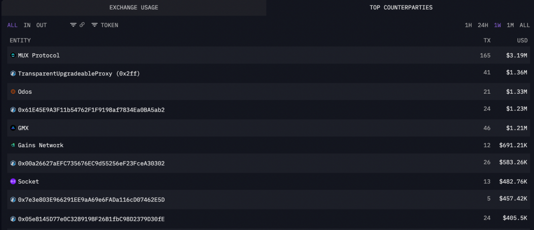 Top Counterparties 栏目中,可以看到该实体最近交互的排行榜,包括交互次数以及交互金额。可以看到一周内,AK 已经交互过 MUX Protoco l1 65 次,交互金额达到了 319 万美金。