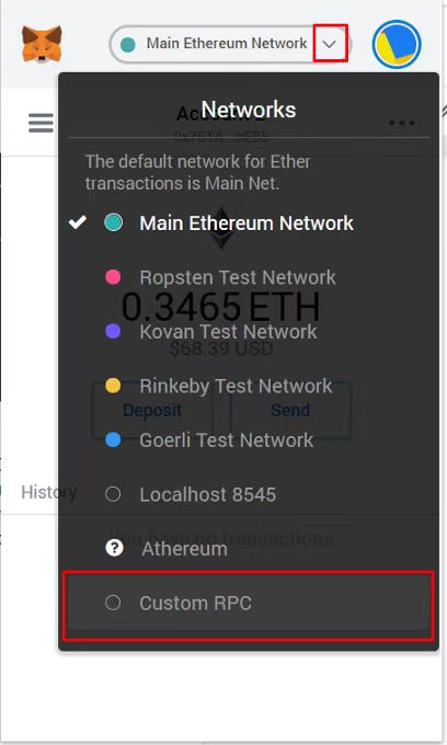 登陆MetaMask -> 点击下拉菜单Networks(网络) -> 选择Custom RPC(自定义RPC)