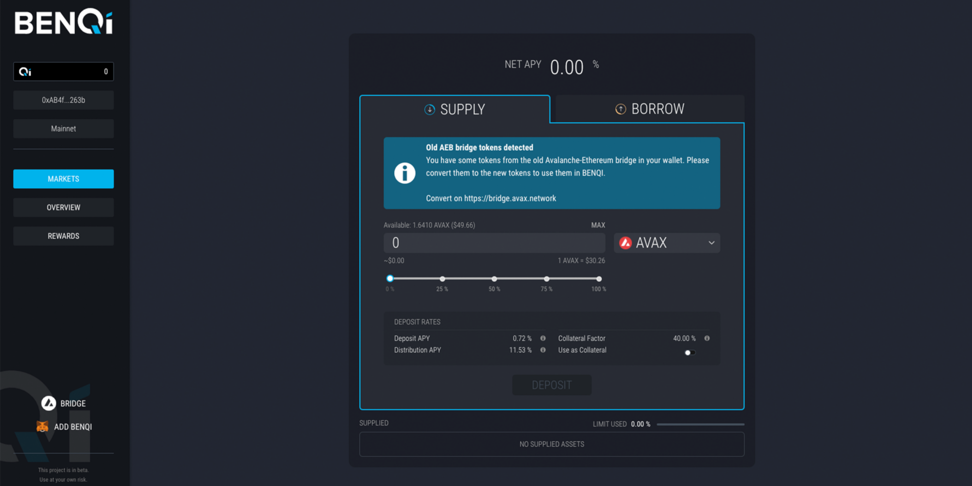 QI代币:QI代币用于表示用户为BENQI协议提供的资产的余额。用户向BENQI提供资产后,会有QI代币存入钱包。QI代币将根据用户提供的资产类型及其利率不断增加。