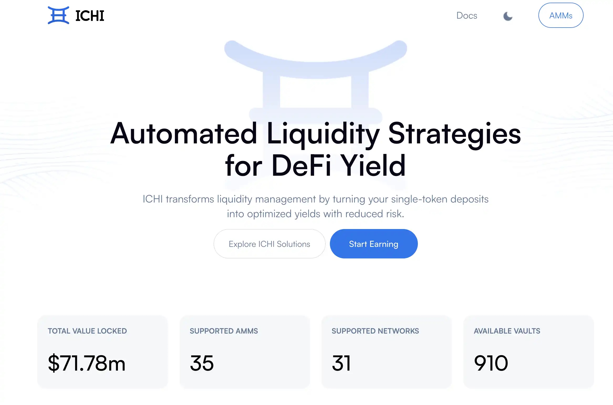 ICHI 是一个非托管 DeFi 协议,简化和优化代币项目、DAO、资产管理者和区块链生态系统的流动性管理。通过支持将单代币存入集中流动性池,ICHI 实现了 AMM 之间的流动性配置流程自动化。ICHI 的自动化金库目的是支持代币发行、维持价格稳定并持续提升流动性深度,同时降低流动性提供者的无常损失风险。