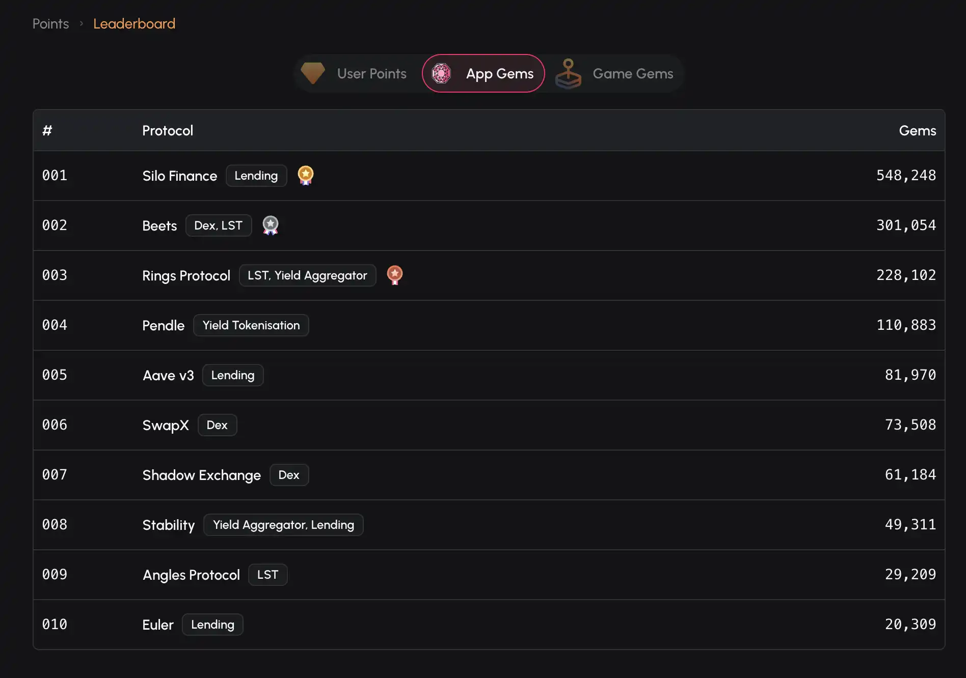 当前 App Gem 前 10 除了 Aave 和 Pendle 这类老牌 DeFi 几乎全都是 Sonic 原生的项目